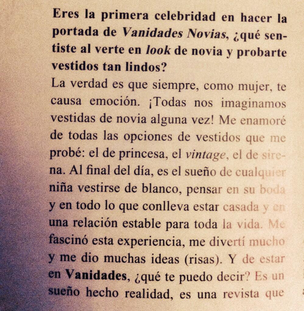 Tradução: Pergunta: Você é a primeira celebridade a fazer uma capa para a Vanidades Novias, o que você sente ao se ver em look de noiva e provar vestidos tão lindos?